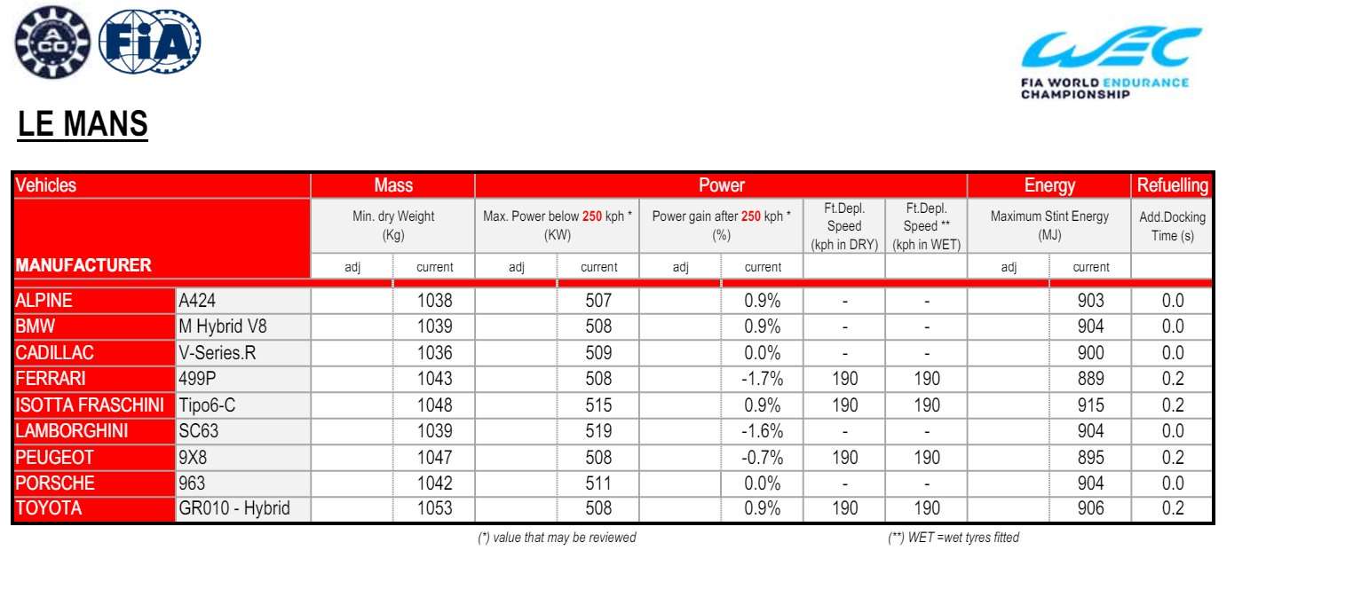 Parametri Balance of Performance Le Mans 2024 – foto: fia.com