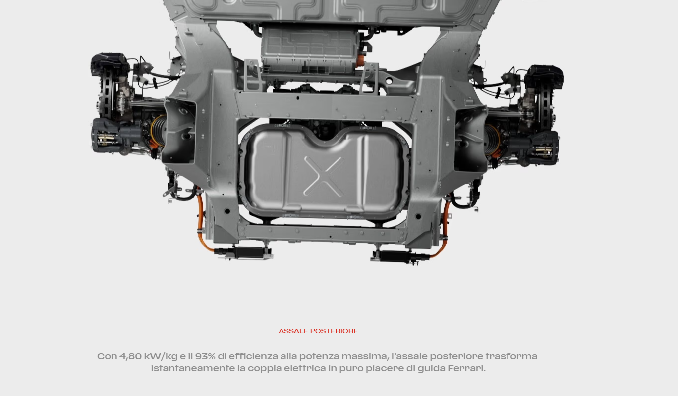 “Progettato interamente da Ferrari, l’assale anteriore ha una potenza di 210 kW con il 93% di efficienza alla potenza massima e una densità di potenza di 3.23 kW/kg. Il sistema Disconnect passa con fluidità alla trazione posteriore, massimizzandone l’efficienza. Spingendo la tecnologia oltre ogni limite, i motori sincroni a magneti permanenti offrono una densità di coppia e potenza eccezionali, grazie a un design che deriva dal mondo motorsport, con geometrie ottimizzate e materiali altamente performanti”.