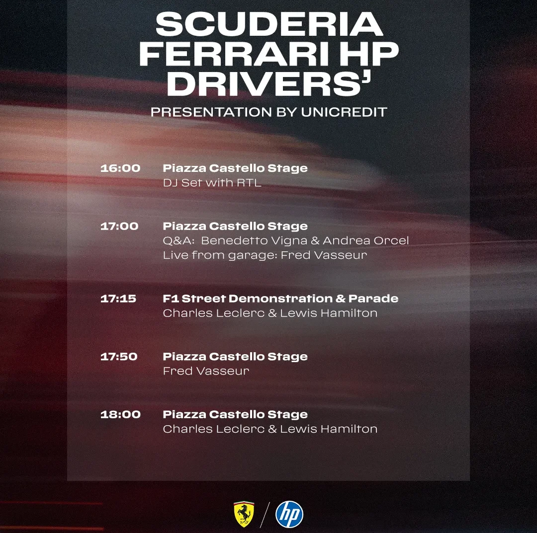 Gli appassionati potranno andare nei pressi di Piazza Castello dal primo pomeriggio, visto che ci sarà dalle ore 16 un DJ set preparato sul palco principale. Lì vedremo anche due monoposto storiche del team italiano: stiamo parlando della F2004 e la 248 F1 del 2006, l’ultima monoposto guidata dal Kaiser dai 25 anni dal suo primo titolo in rosso. A partire dalle 17 faranno la loro apparizione i due CEO di Ferrari ed UniCredit, Benedetto Vigna ed Andrea Orcel. Ad accoglierli ci sarà il team di Sky con Carlo Vanzini, Vicky Piria e Ivan Capelli.