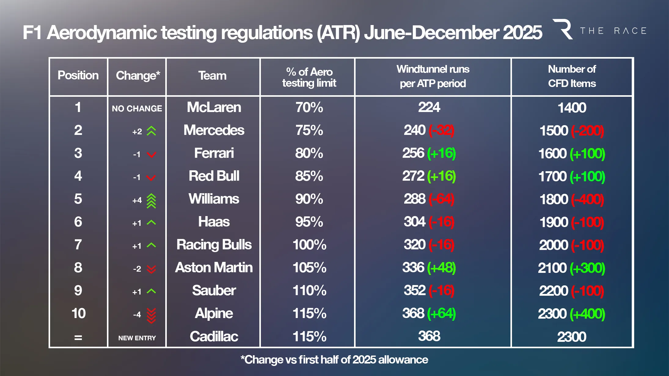 Il sistema ATR (Aerodynamic Testing Restrictions) limita le modalità in cui i team sviluppano le loro auto in galleria del vento e l’utilizzo del CFD (Fluidodinamica Computazionale). Quest’ultimo si serve di modelli matematici per simulare, trarre dati e analizzare come i flussi attraversano una vettura. Abbiamo spiegato che chi arriva davanti ottiene più limitazioni. Quest’anno il reset di metà stagione è avvenuto tra il GP del Canada e quello dell’Austria, ovvero il 22 giugno. Dal lunedì che ha preceduto la gara al Red Bull Ring le squadre hanno ricevuto le percentuali di cui potranno usufruire in termini di ore in galleria del vento e nel CFD.