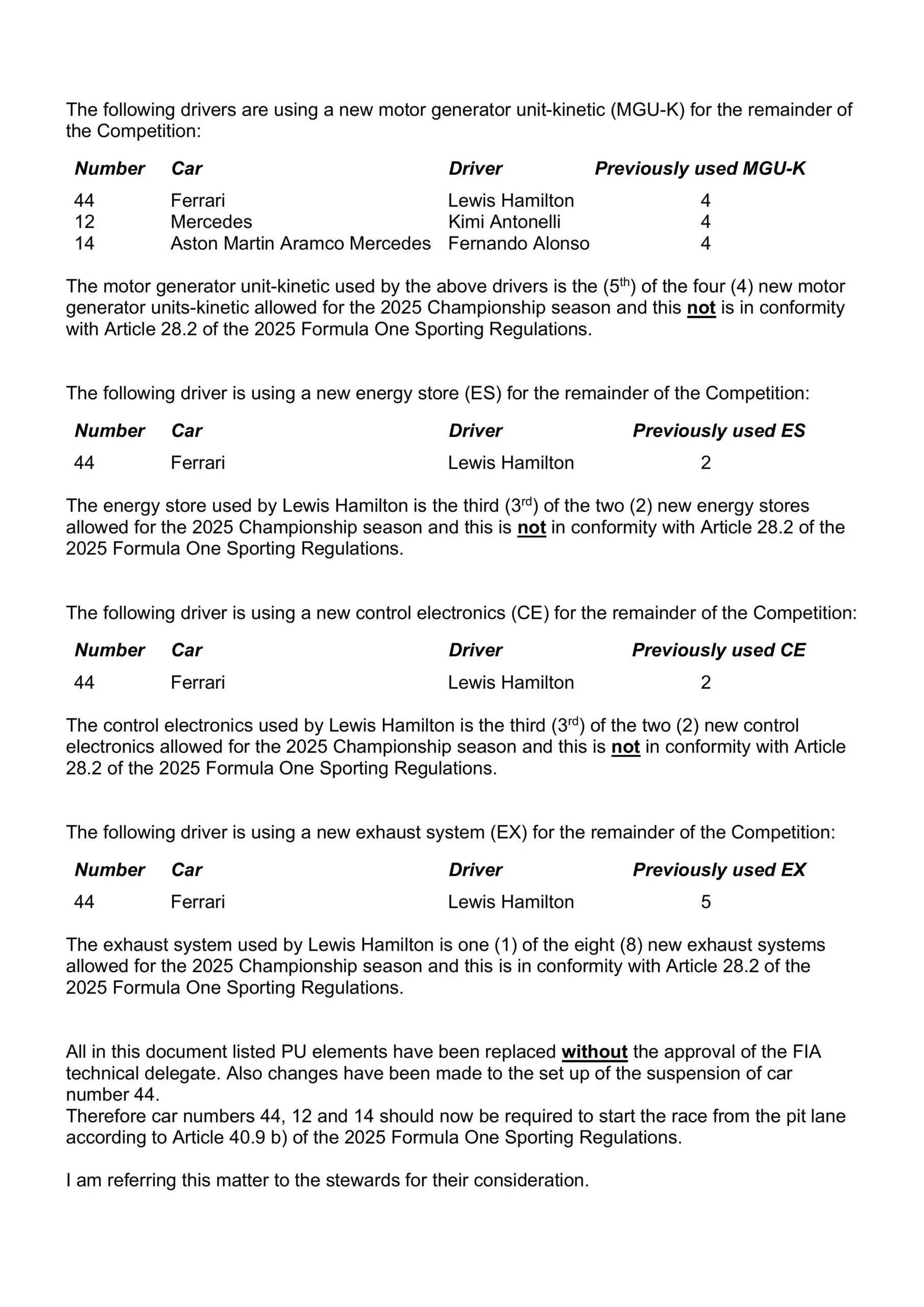 La FIA ha ufficializzato che Lewis Hamilton scatterà dalla pit-lane. Sappiamo che Ferrari era arrivata già al limite con tutte le componenti del motore ed ha quindi deciso di trovare qualcosa di utile in una situazione negativa. Scattare dalla sedicesima non avrebbe fatto la differenza. La squadra di Maranello ha quindi sbloccato un’altra unità, la quinta, che potrà sicuramente servire all’inglese in un campionato molto lungo. Inoltre sulla SF-25 di Hamilton sono stati effettuati dei cambiamenti alle sospensioni per avere qualche vantaggio in condizioni di asfalto bagnato.