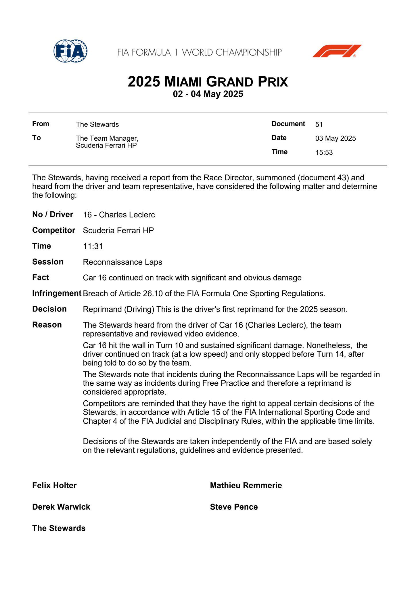 Prima dell’inizio della Sprint di Miami, nel giro di formazione utile per andare a posizionarsi in griglia di partenza, Charles Leclerc ha sbattuto la sua SF-25 contro le barriere vanificando così la sua partecipazione alla ‘gara corta’; dopo il danno potrebbe arrivare anche la beffa, visto che il monegasco ha ricevuto un’investigazione della FIA ed ecco la decisione su una possibile penalità.